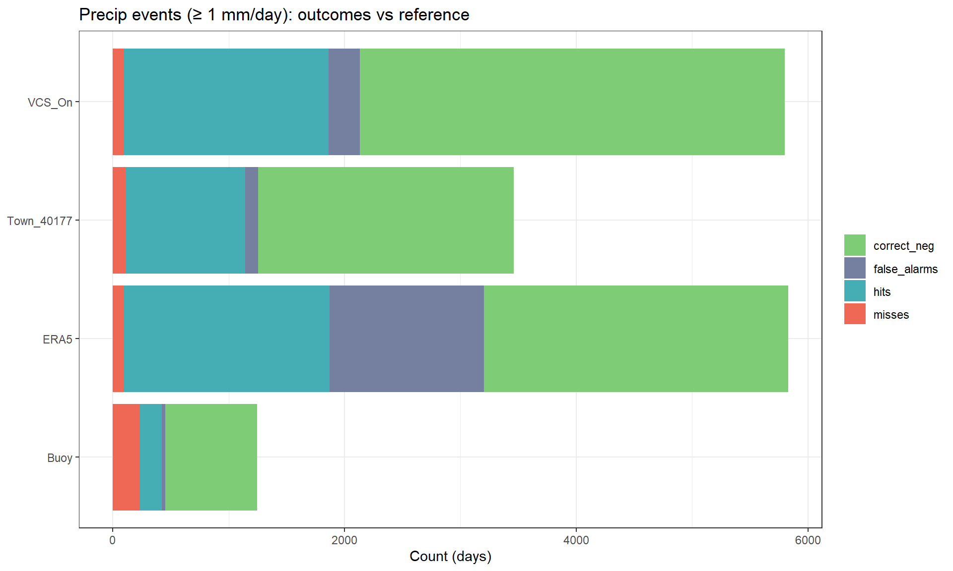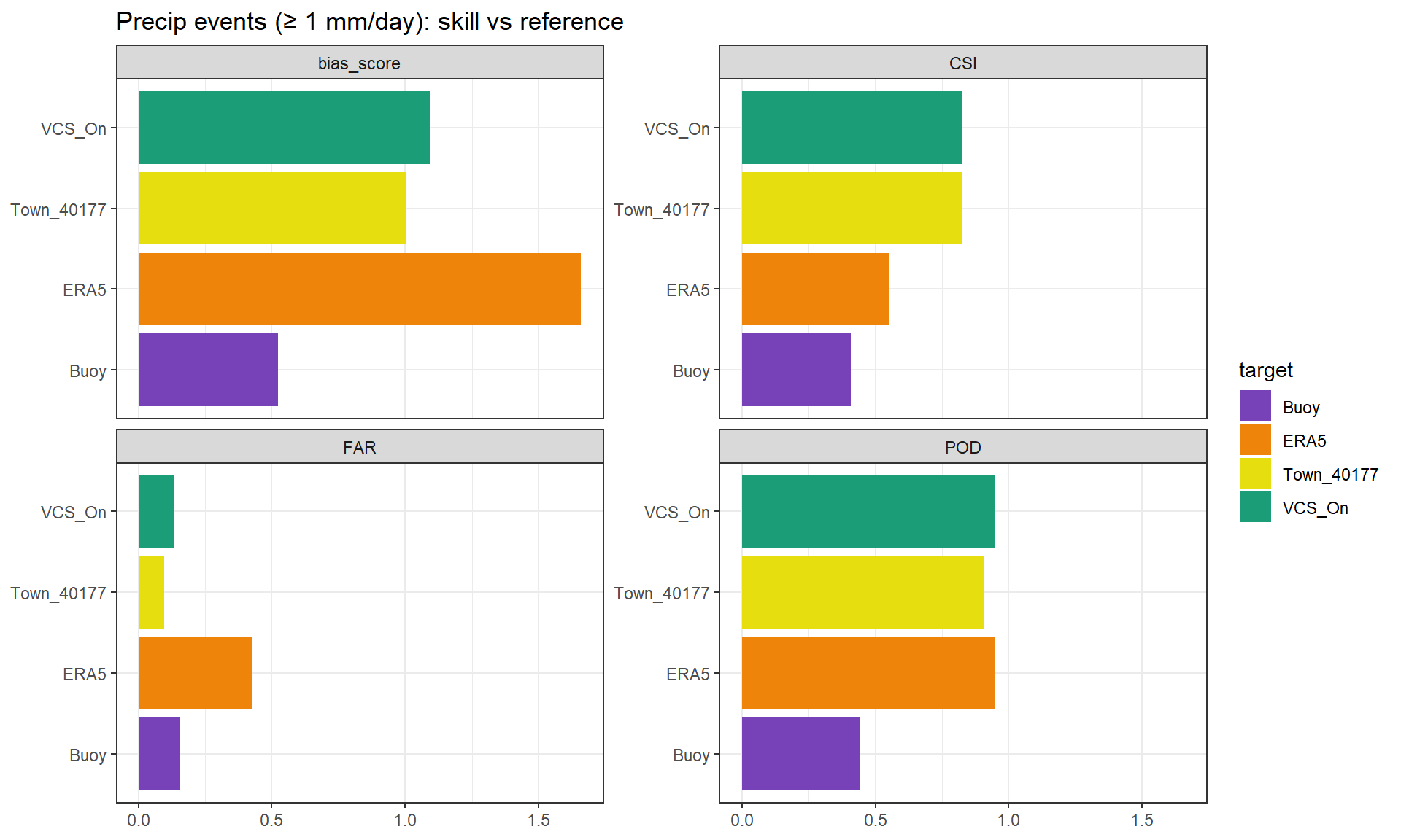 ERA5 VCS and Town all have a bias score 1 or >1 and 0.9 or greater POD, indicating over prediction of rain (more false alarms), while the Buoy data has lower bias score (0.52) and POD (0.44) showing it underpredicts rain events. Even thought ERA5 had the highest POD it also had the highest FAR (0.42) while VCS has the lowest FAR and strongest CSI (0.827). Town also produced a strong CSI (0.824) while ERA5 and Buoy both have weak to moderate scores.