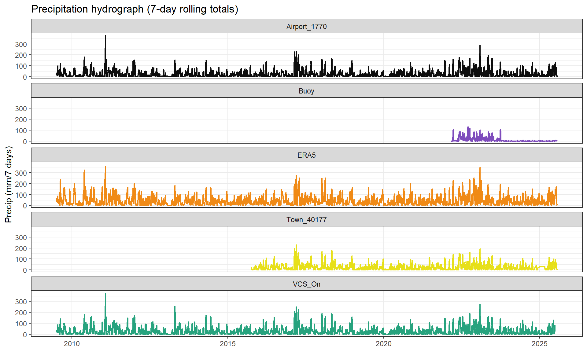 Precipitation event structure: The following plots show how precipitation volumes and timing align across datasets.