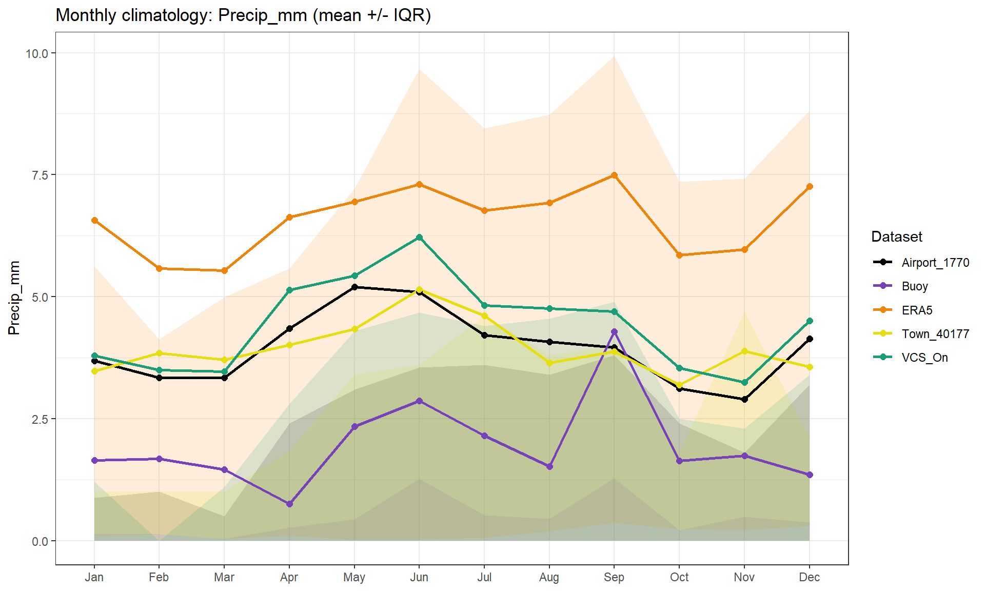 All datasets show a winter spring increase and a relative summer decrease, but the magnitude differs substantially. ERA5 is consistently wetter than the reference across months, while Buoy is clearly drier exept for september. Town_40177 aligns closely with the airport, and VCS_On is slightly wetter in several months but closer in the warmer dryer parts of the year. Wider IQRs for ERA5 indicate more variability and heavier tails.