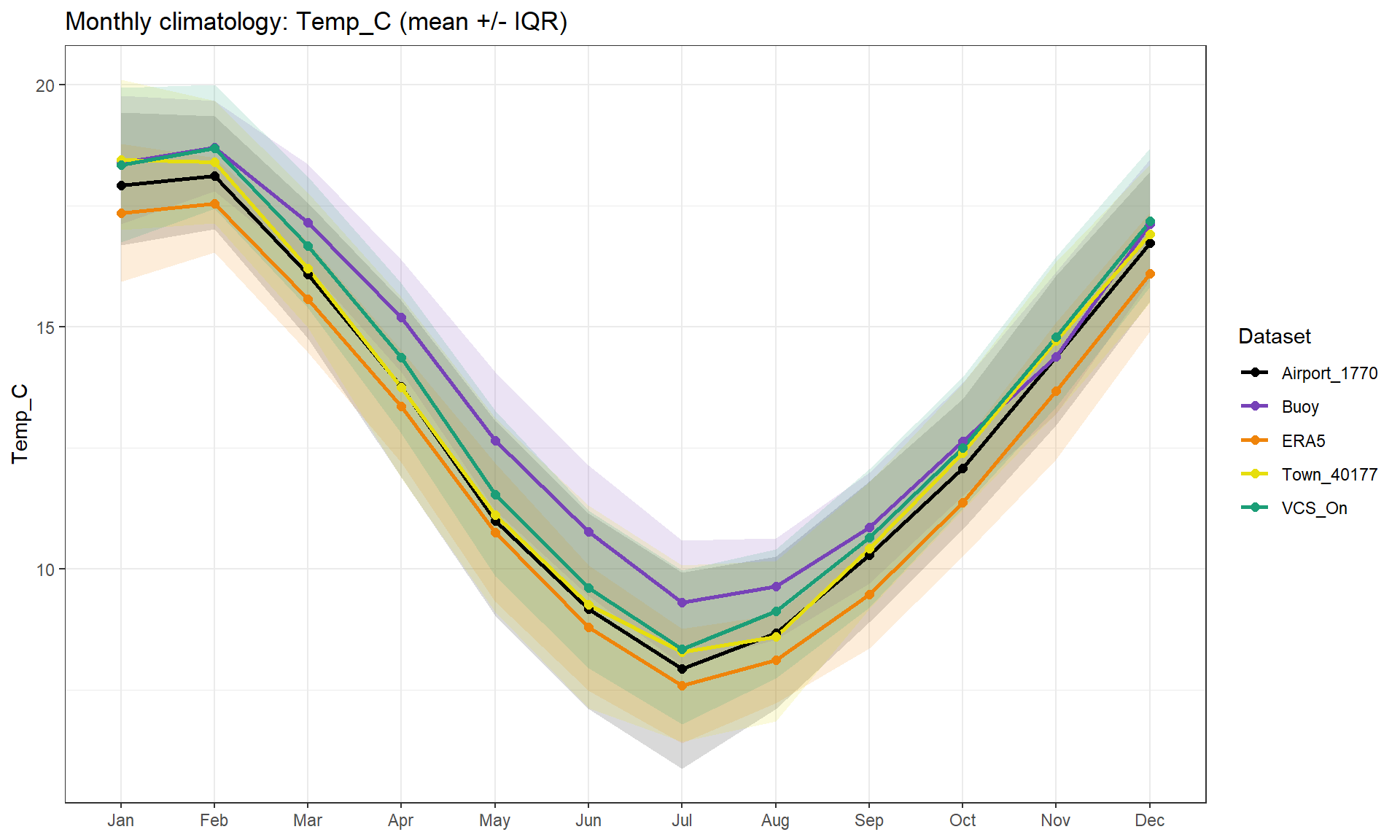 All datasets reproduce the same seasonal cycle (summer peak, winter minimum). ERA5 is consistently cooler than the reference, while Buoy and VCS_On are warmer. Town_40177 tracks the airport most closely across all months. IQR bands broadly overlap, indicating similar seasonal variability, but the persistent offsets indicate systematic seasonal bias rather than random error.