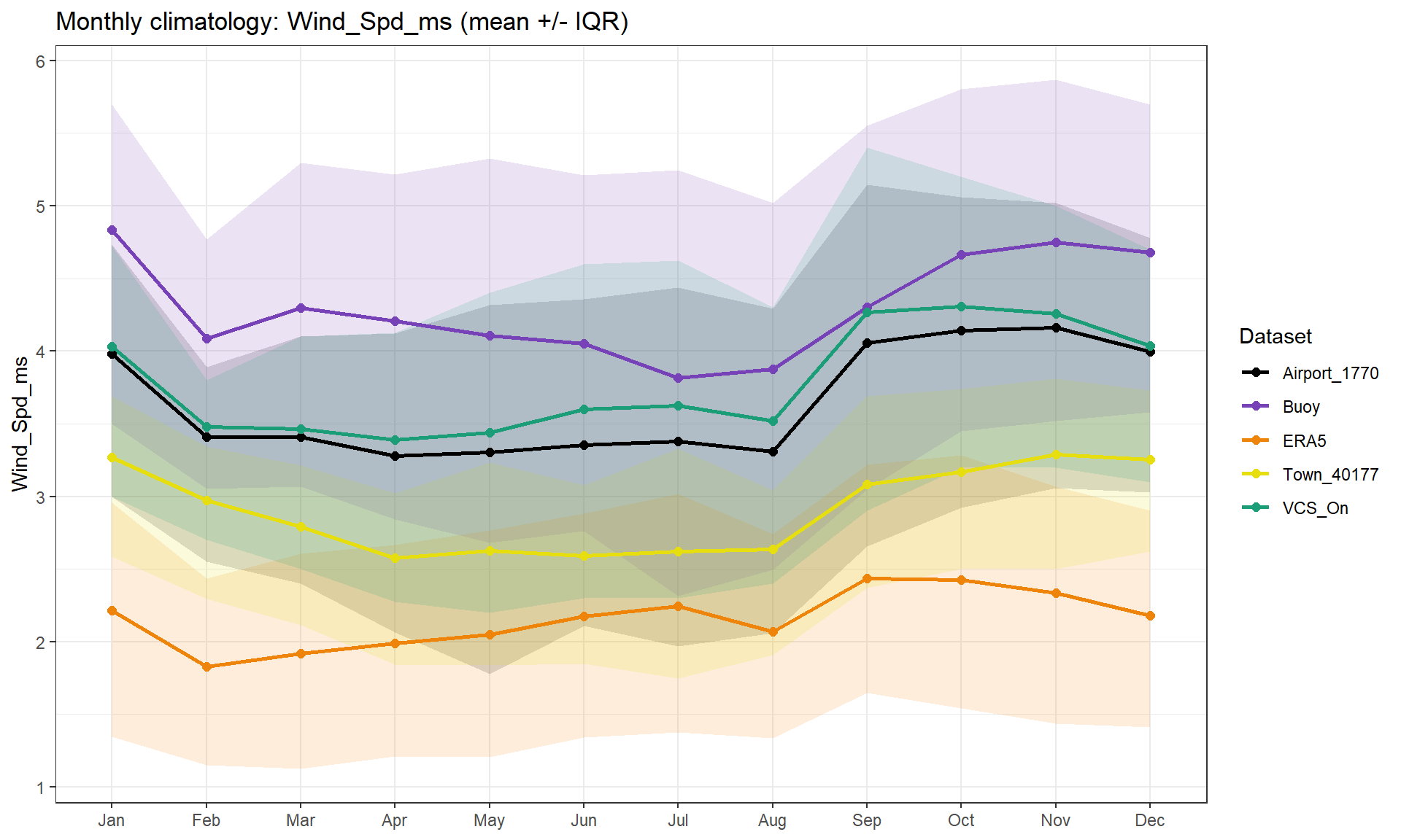 All datasets show higher winds in spring and summer and lower in winter, but the magnitude differs. ERA5 is consistently lower than the reference across all months (systematic low bias). Buoy and VCS_On are higher than the reference, while Town_40177 is lower. The VCS_On bands are closest to the reference, The thisckness in the IQR bands suggest greater variation or local effects.