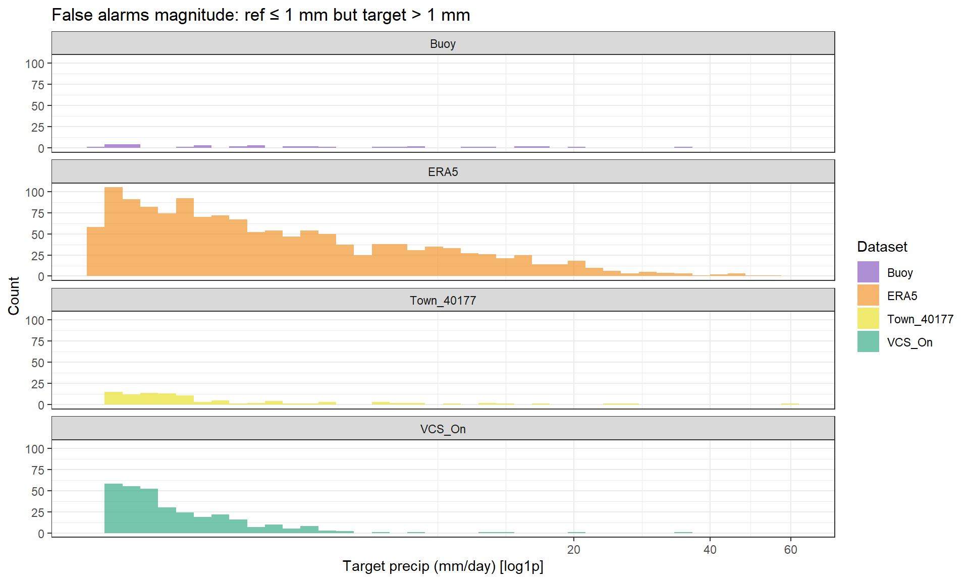 ERA5 shows the largest and most frequent false alarm magnitudes, while Town_40177 and VCS_On are more constrained. Buoy contributes few false alarms but also fewer detected events overall.