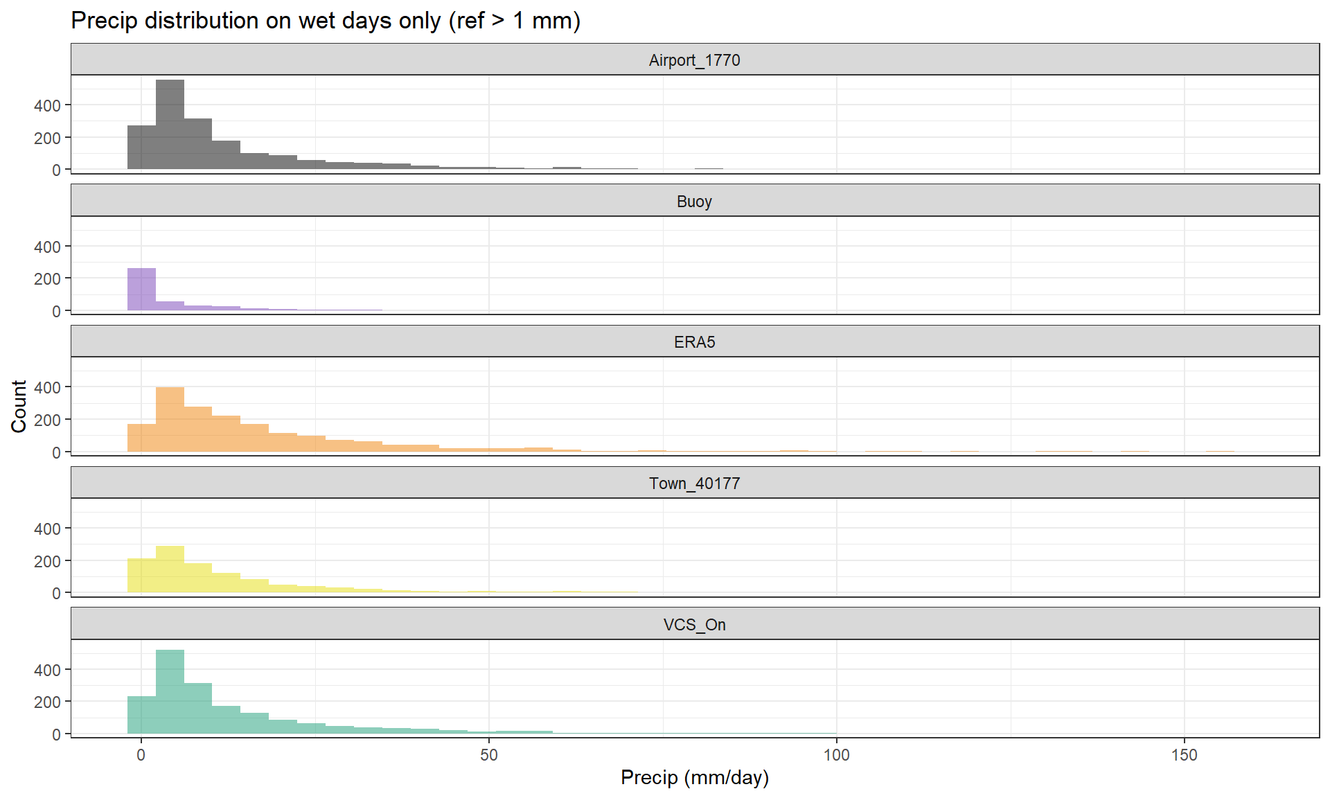 ERA5 shows the broadest distribution and the longest upper tail, which aligns with overestimation of heavier events. Town_40177 and VCS_On align more closely with the reference shape, indicating better magnitude agreement on wet days. The buoy distribution is pressed toward lower totals, indicating underestimation of event magnitudes.