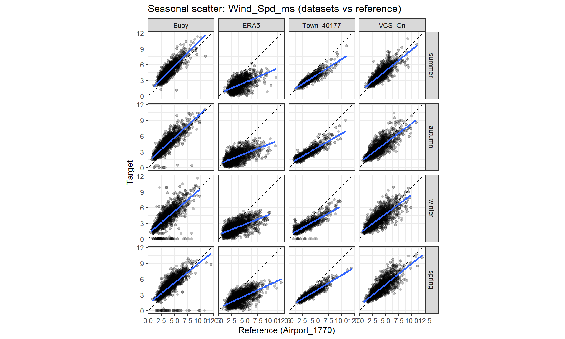 Town_40177 and VCS_On show tighter clustering around the 1:1 line across seasons, indicating stronger agreement. ERA5 shows systematic underestimation (regression slope < 1) in all seasons, especially at higher winds. Buoy shows reasonable agreement but with more spread in summer and spring.