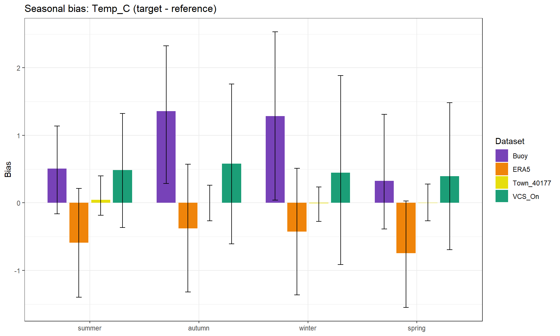 ERA5 is cool biased in all seasons, most pronounced spring. Buoy shows a warm bias in all seasons, especially autumn/winter. Town_40177 is near zero in every season (best match). VCS_On is consistently warm biased but smaller than Buoy.